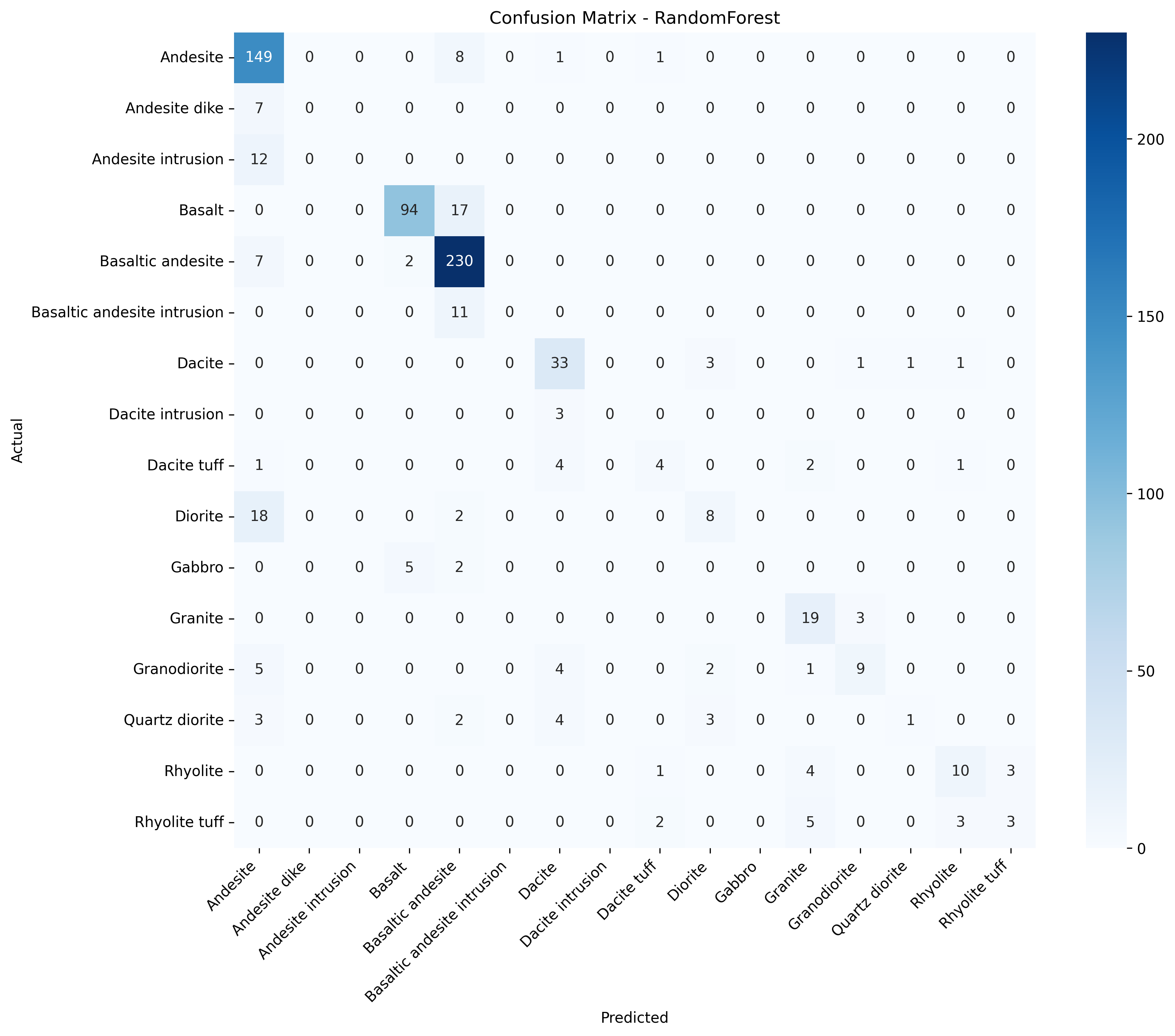 Description: This project utilizes Python-based machine learning models to classify igneous rocks according to their geochemical composition. The dataset, sourced from Kaggle, includes geographical locations and major oxide components.The workflow encompassed: