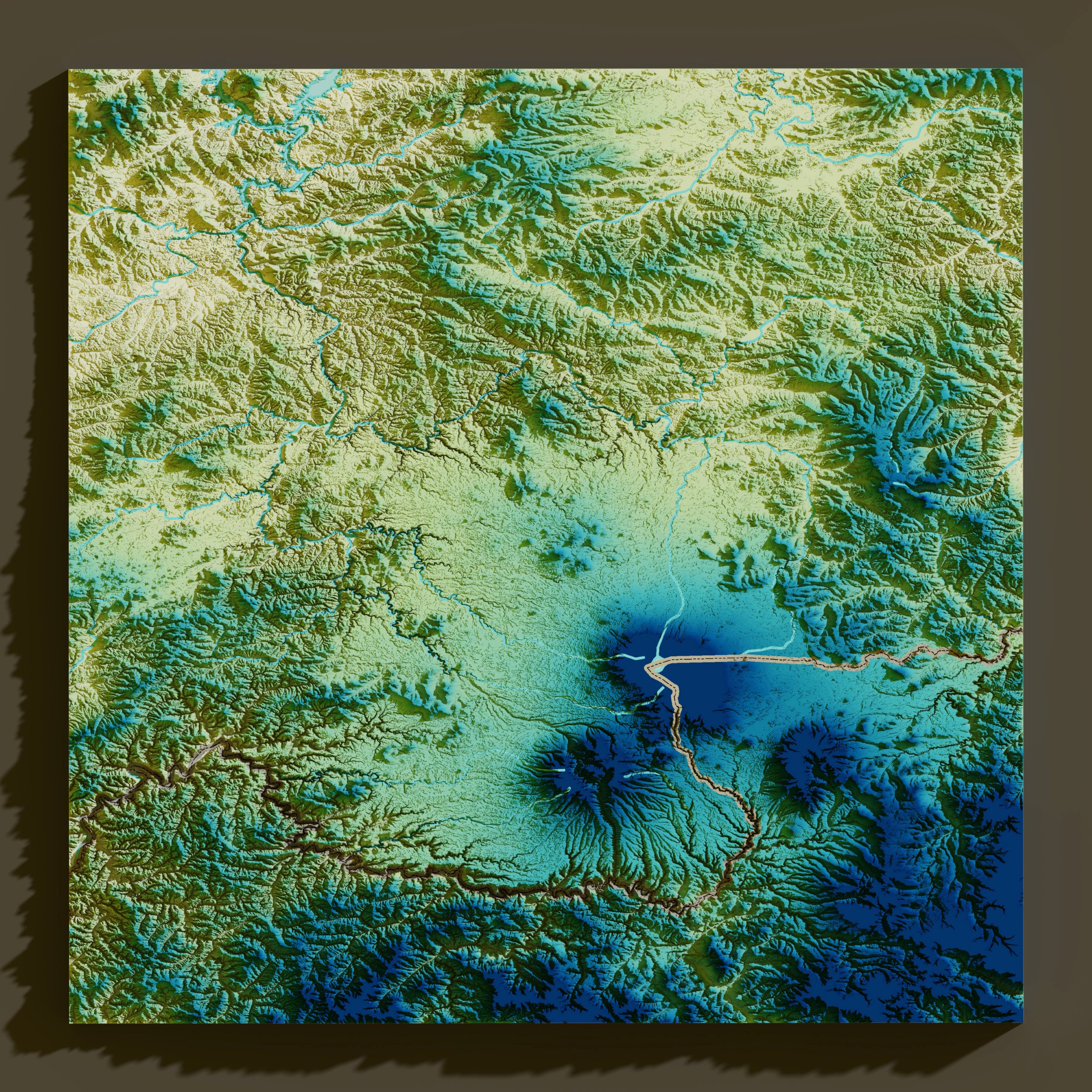 The color scheme for the 3D DEM was inspired by the ancient Chinese masterpiece, "A Thousand Li of Rivers and Mountains."